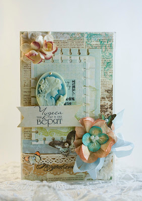 Бумага Galeria Papieru, чипборд Prima, цветочки Таиланд и Прима, лента с розочками, дырокол края Марты Стюарт, полужемчуг, иголочки с жемчугом, дистресс чернила, уголки из полимерной глины, сделанные с помощью молдов.