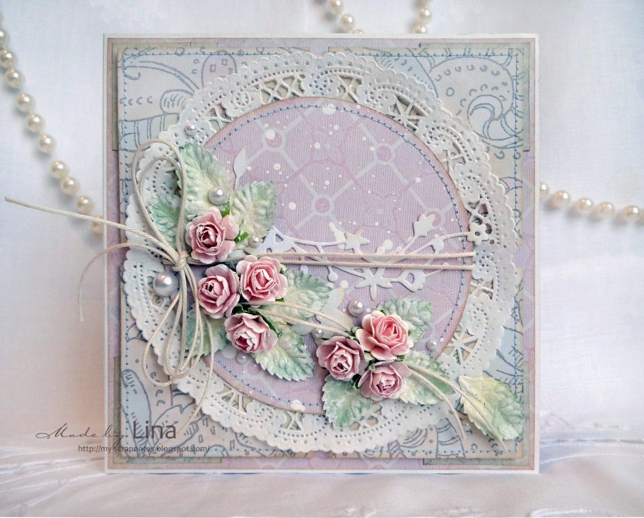 Бумага Melissa Frances последней коллекции, бумажная салфетка, шнур хлопковый, бумажные цветы и листья, белый акрил, дистресс-чернила, вырубка, полужемчуг, вспененный скотч, машинная строчка.